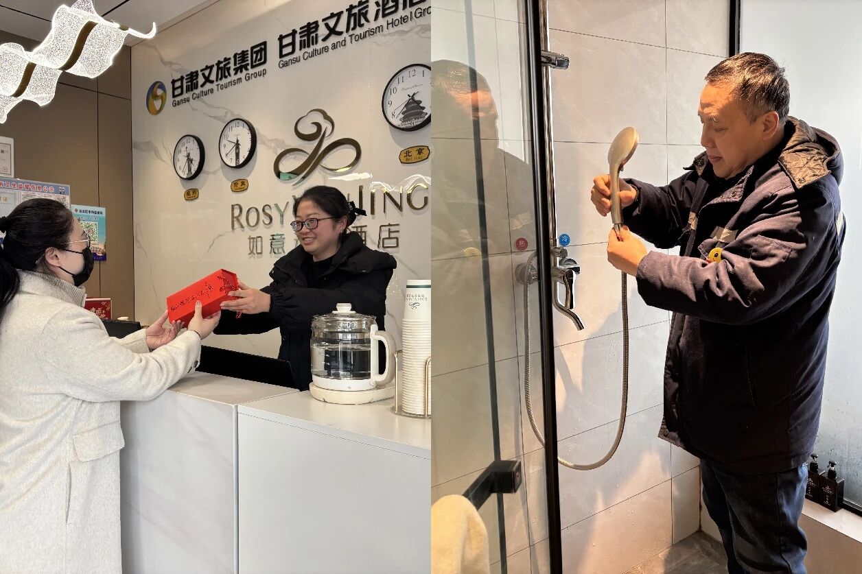 天水和谐园前台服务人员手写新春贺卡,将节日祝福送至每位住客手中;工程保障团队完成客房及相关设施巡检,确保各项设备系统运行稳定可靠,全力以赴为宾客营造安心、顺心的入住体验。