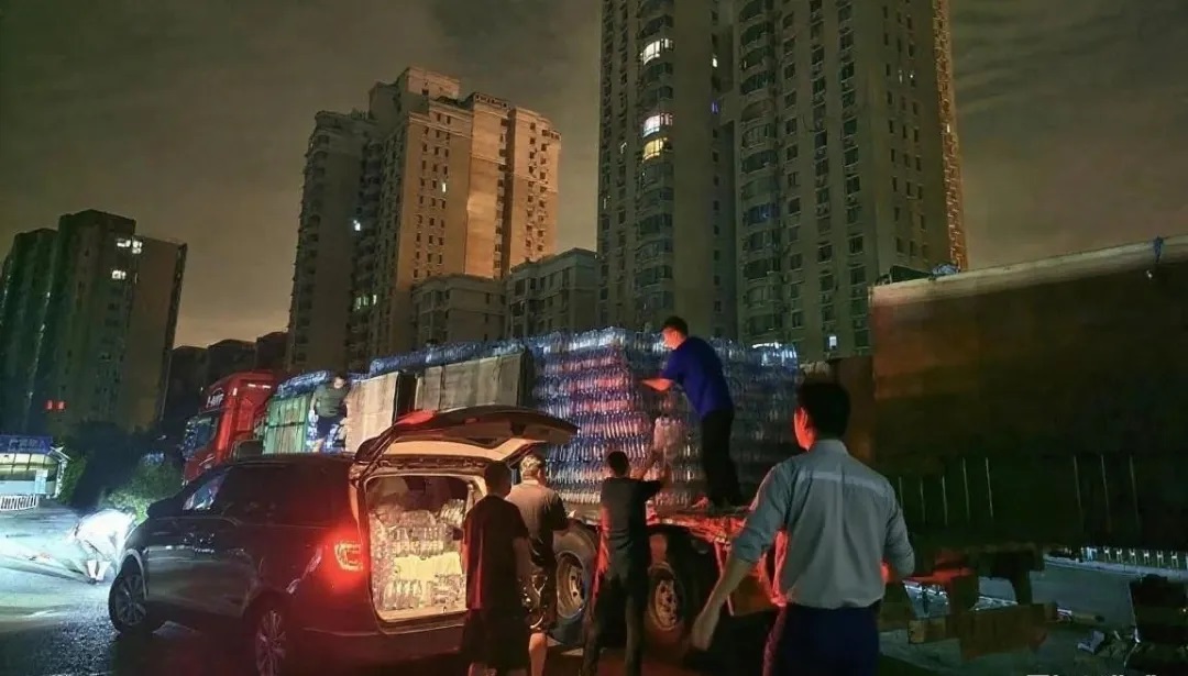 抵达现场后,员工们即刻划分为卸货、搬运、码放三个工作组,在闷热难耐的库房环境中,一条高效运转、衔接紧密的协作链条迅速形成:一组人员全力配合,将矿泉水从货车卸至转运三轮车;二组人员争分夺秒,驾驶三轮车在库房内往返穿梭,完成物资转运;三组人员则在货架区域接力配合,将矿泉水逐层码放,井然有序。在北京35度的高温天,库房内热浪蒸腾,员工们的工装转瞬即被汗水浸透,但大家仅以毛巾简单擦拭后便再度投入工作,全程无人言累、无人抱怨。