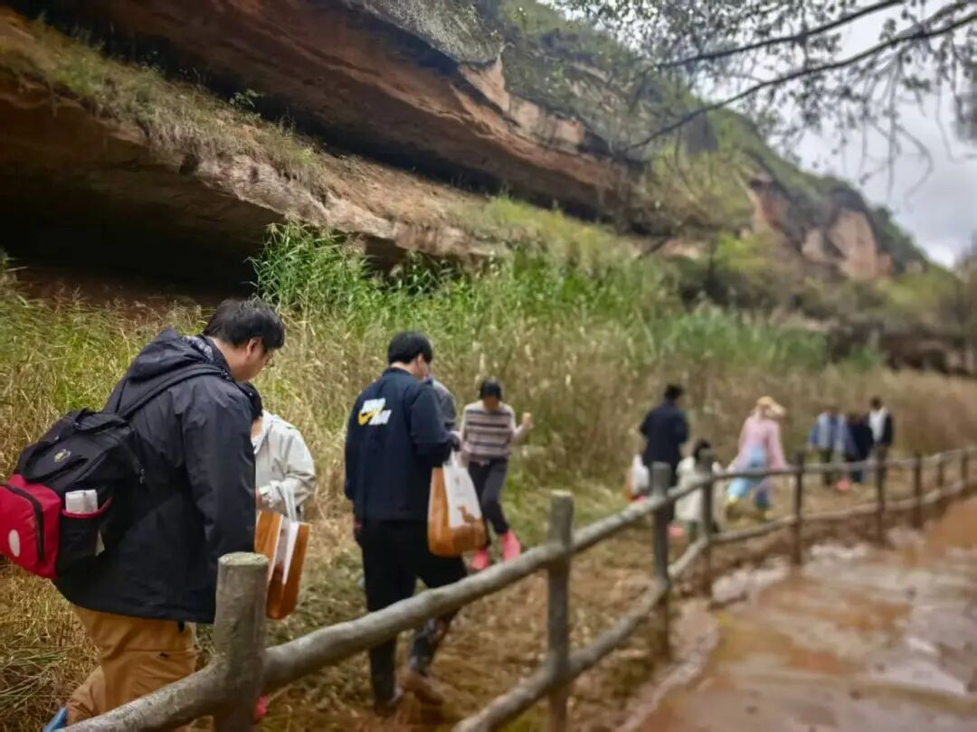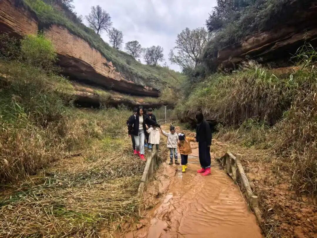 入夜后的篝火晚会,是游客最期待的环节。民宿管家点燃木柴,跳动的火焰照亮庭院,白天在龙栖谷并肩赏景的游客,不分年龄,自发围成圈拉手跳兔子舞,孩子们在篝火旁追逐嬉戏,笑声与歌声在山谷间回荡。“平时工作忙,好久没这么热闹了!白天和陌生人看风景,晚上围篝火唱歌,特别放松。”江苏杨女士主动与邻座游客交换联系方式,约定春节再来:“冬天的龙栖谷肯定别样美,住暖烘烘的窑洞,看丹霞裹雪、冰窟映霜,吃着土暖锅,想想都期待!”